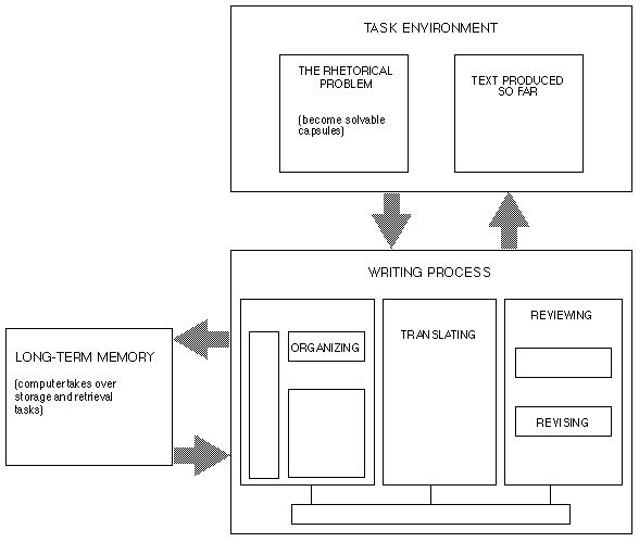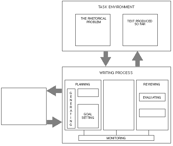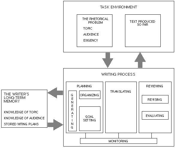 What does this testimony mean in terms of cognitive skills used in the writing process? According to Flower and Hayes (1981), who have devised a writing process model widely accepted in writing research today, writing includes planning, generating, translating, evaluating, revising, and monitoring plus various subskills which are illustrated in the model. These skills require a writer to be able to move easily between short and long-term memory, perceive relationships, encode into language symbols and attend to a wide array of signals and messages. (See Figure 1.)